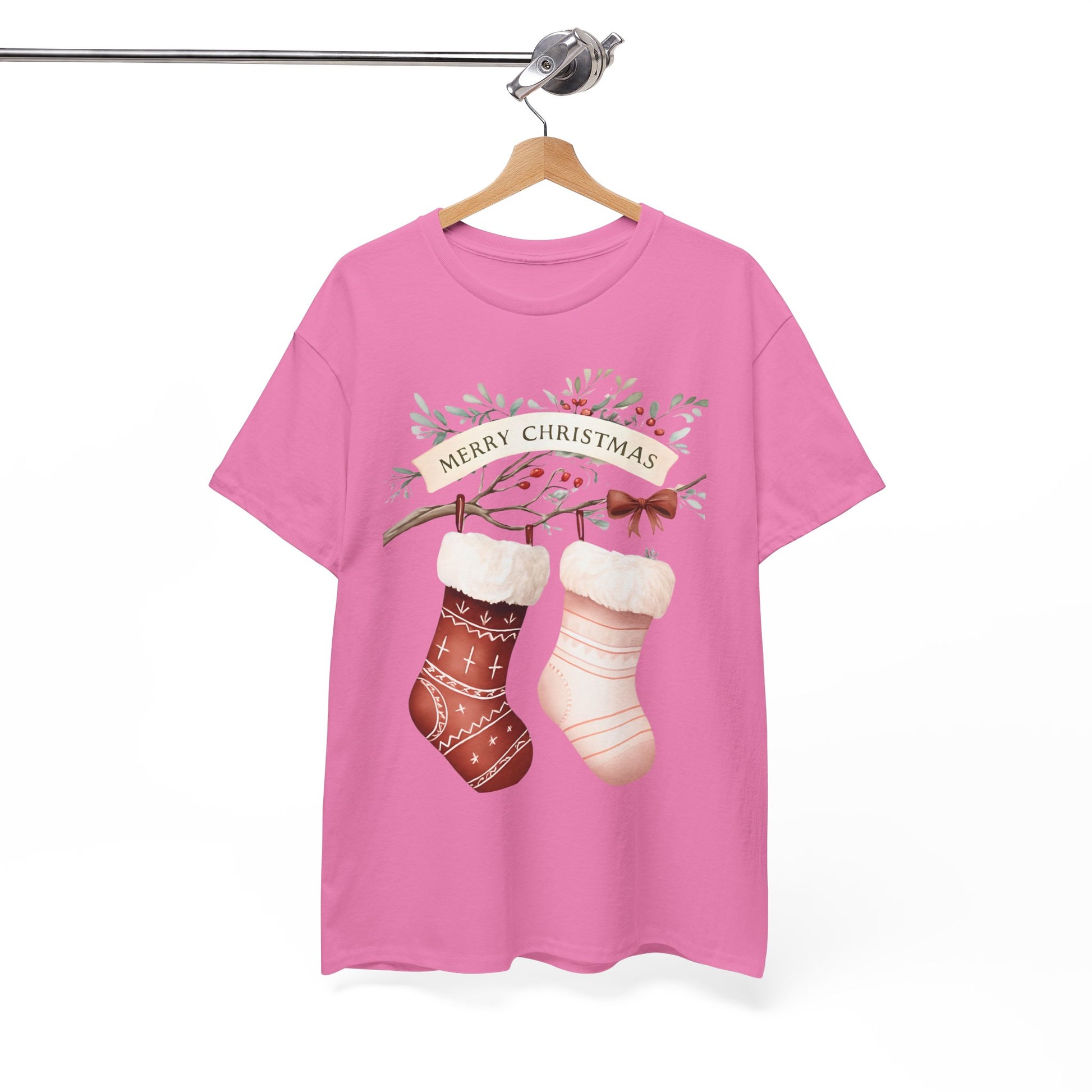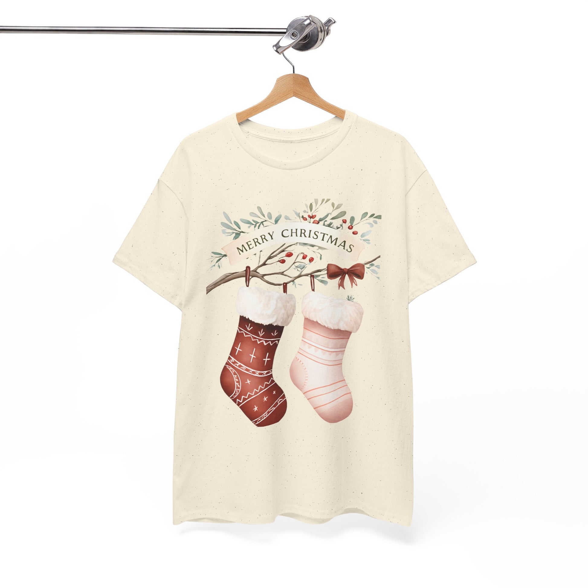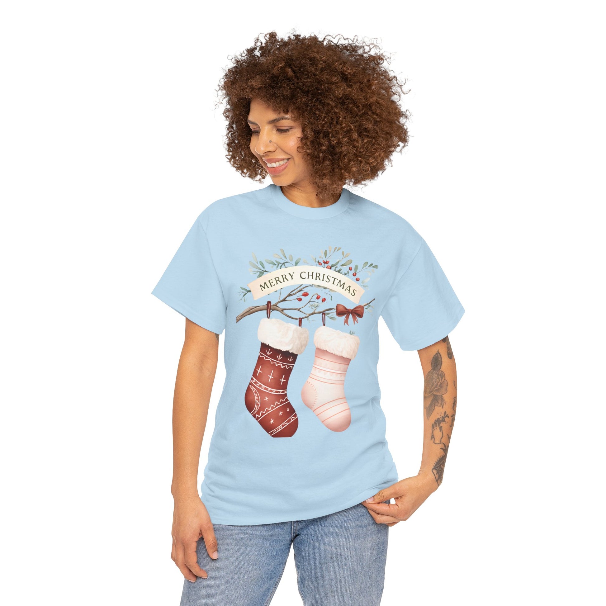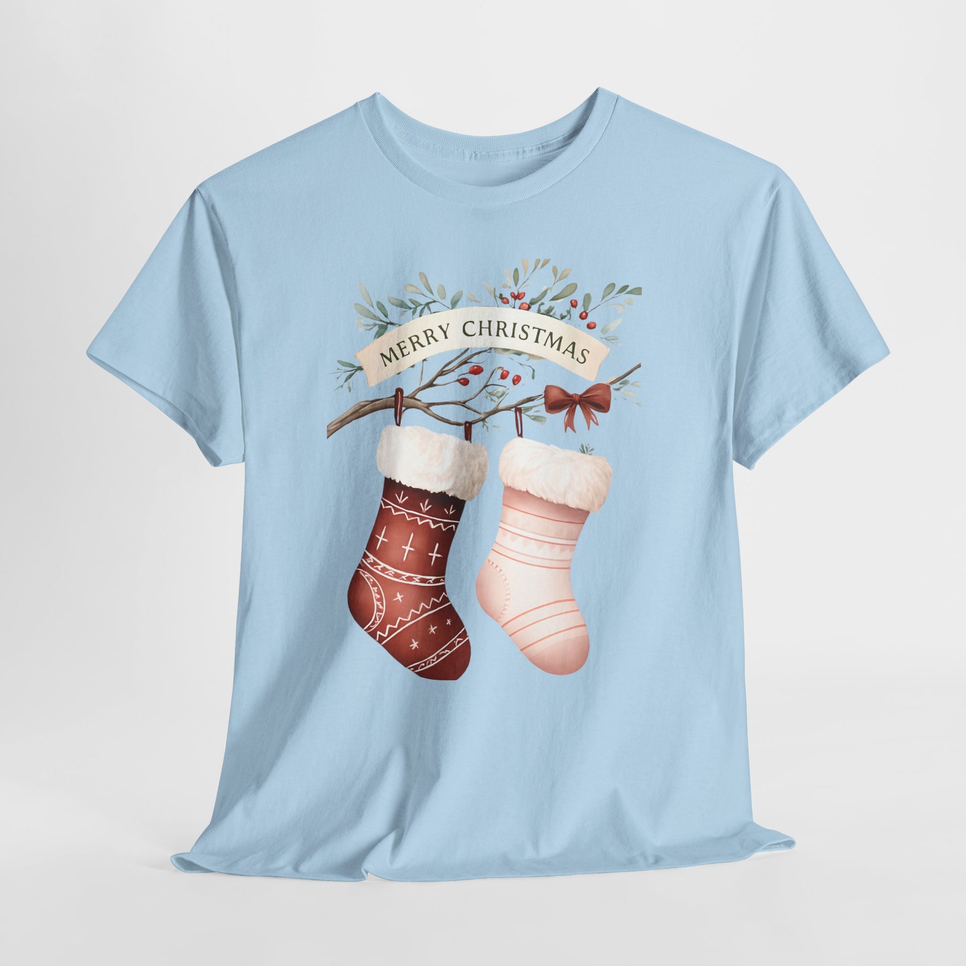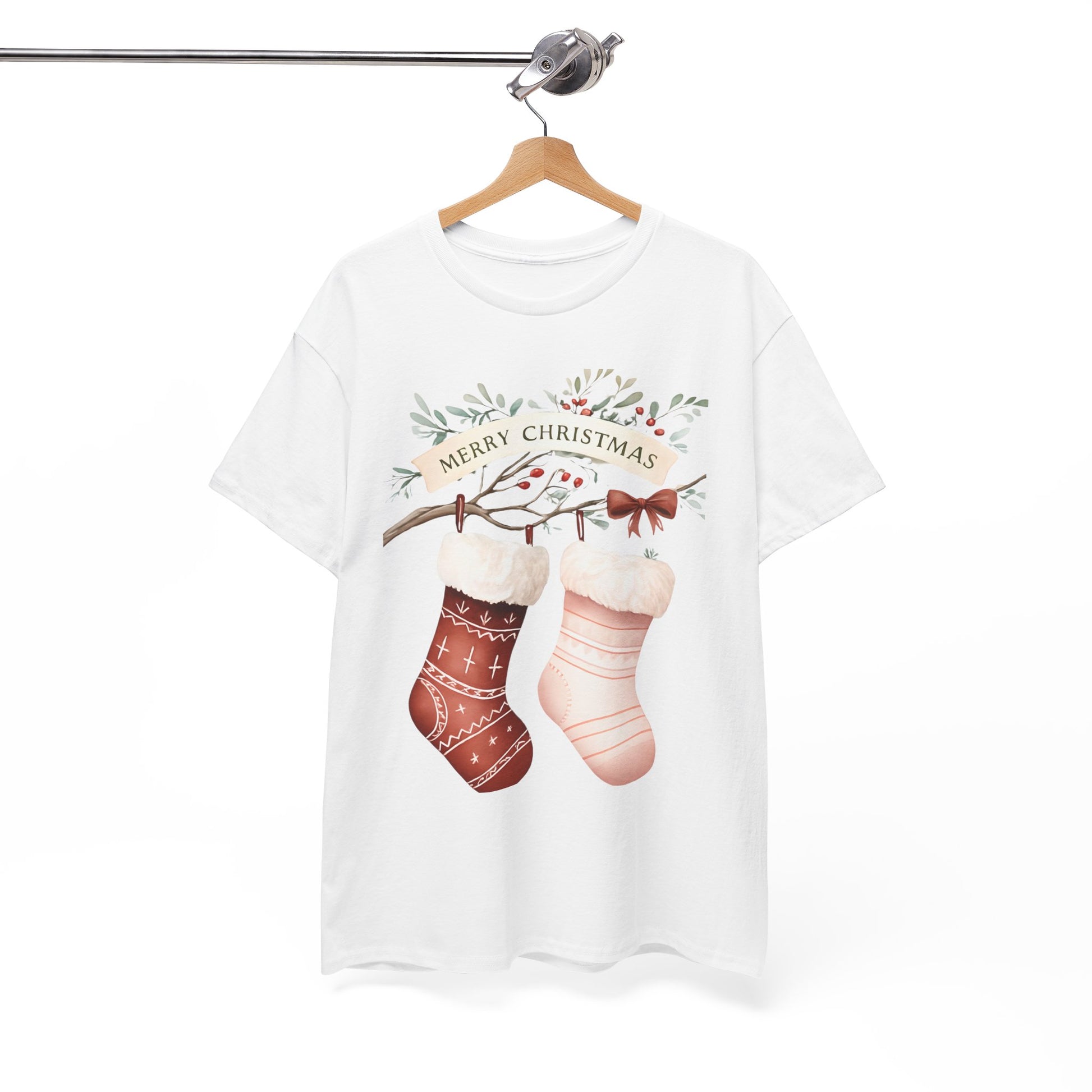 Embrace the spirit of hope and love this Christmas season with our unique watercolor-style tee. Featuring a festive branch adorned with stockings and a 'Merry Christmas' banner, this design radiates warmth and holiday cheer. Perfect for showing support and raising awareness, this soft and comfortable unisex shirt makes a meaningful gift. The delicate watercolor aesthetic and empowering message create a truly special piece.