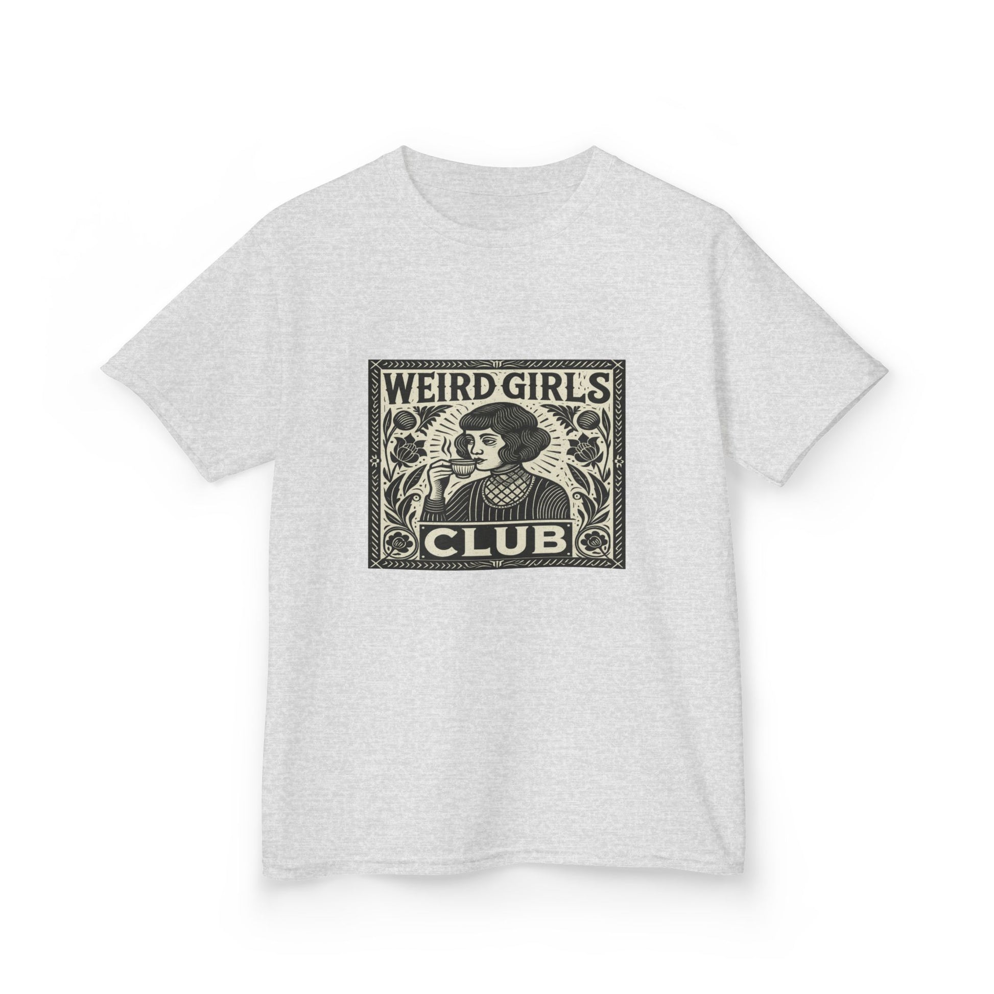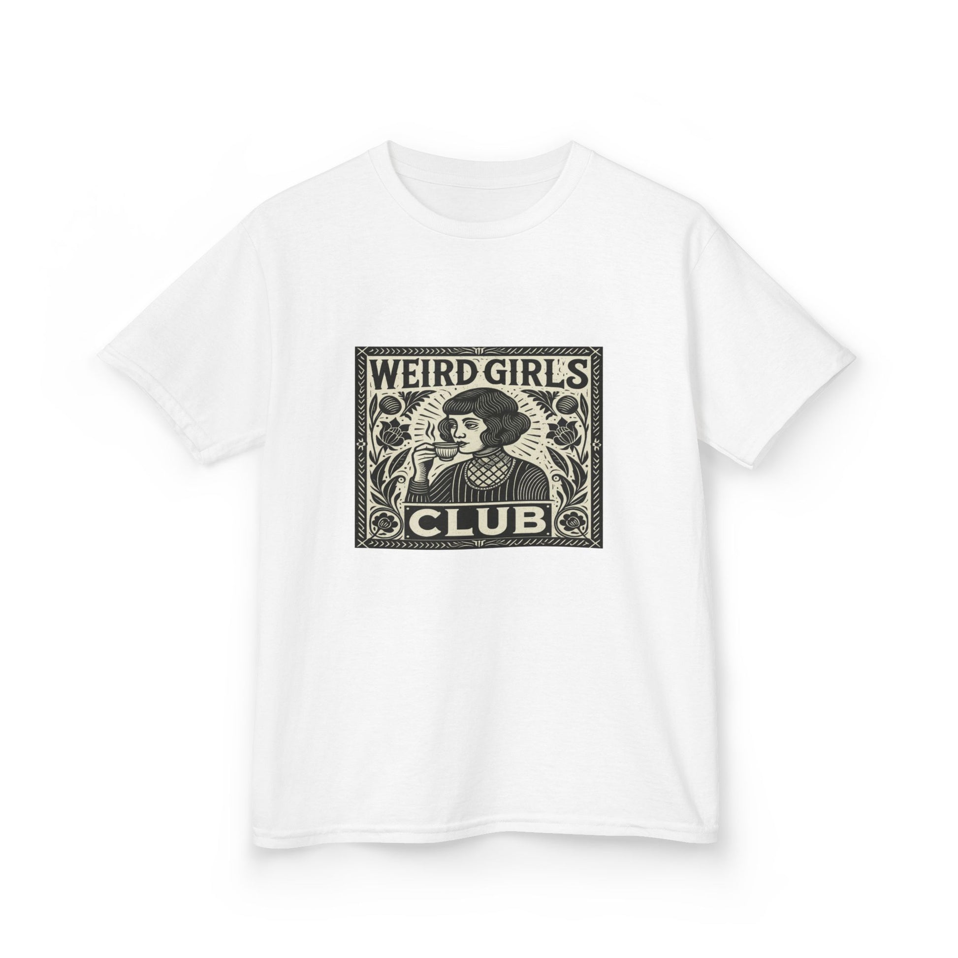 Embrace your unique style with this vintage-inspired tee! Featuring a striking woodcut-style illustration of a woman sipping tea, this shirt is perfect for the 'Weird Girls Club.' With a high-necked, striped blouse and diamond-patterned collar, this tee is a playful nod to vintage aesthetics, perfect for kids' parties and fun outings. Made of soft, comfortable fabric, it's a cool graphic tee kids will love, and makes a great gift!