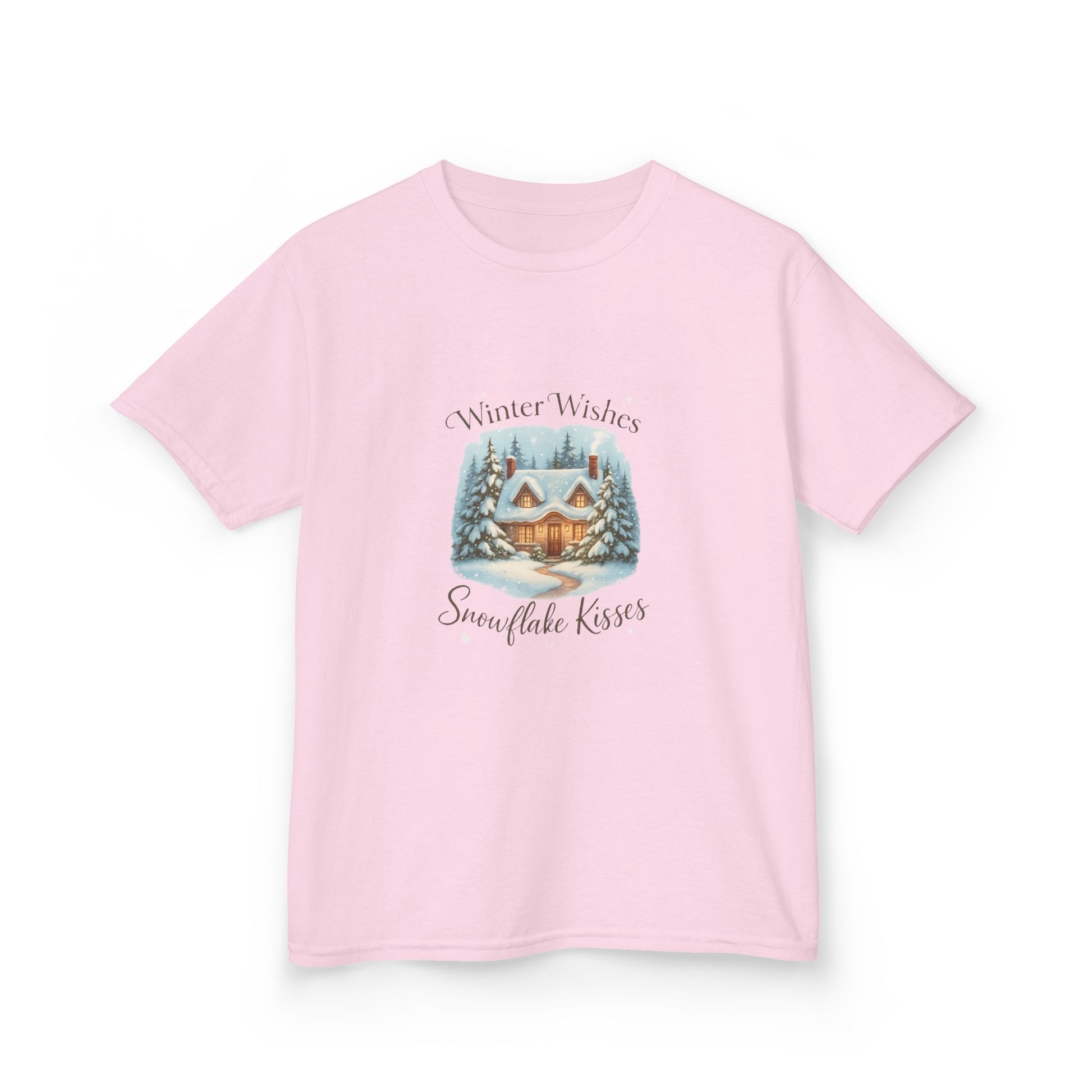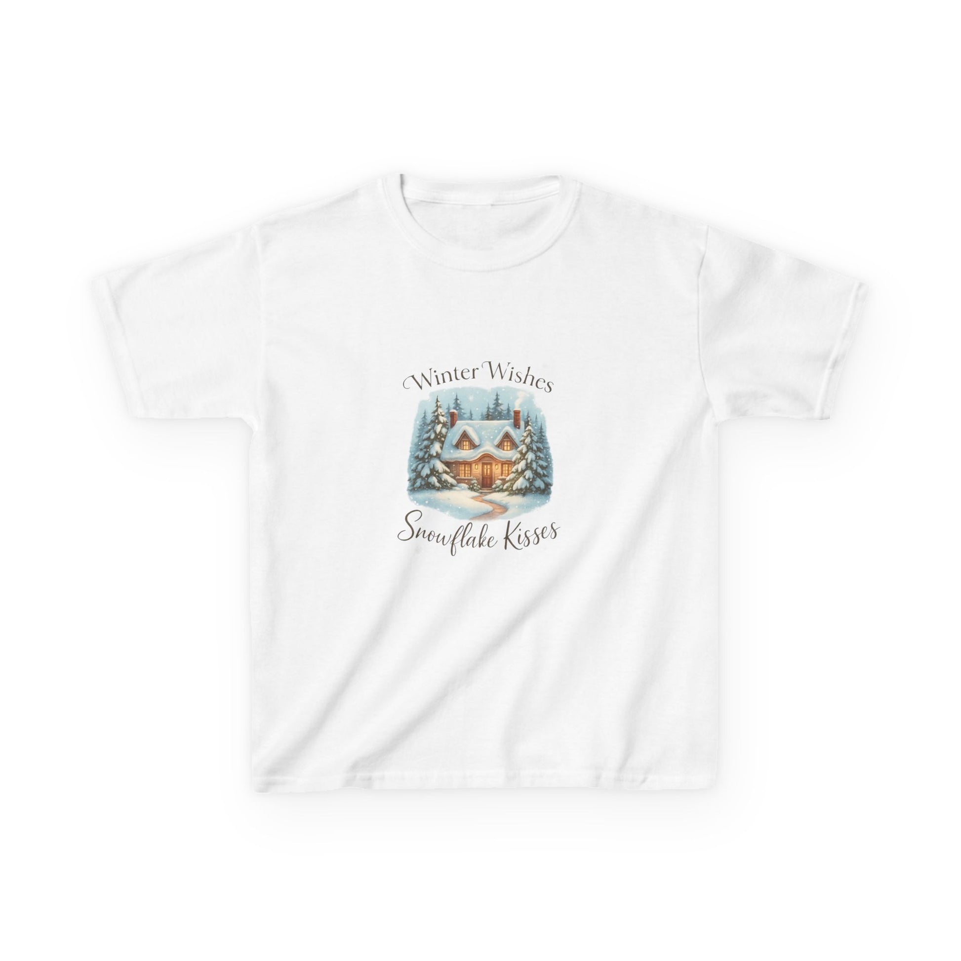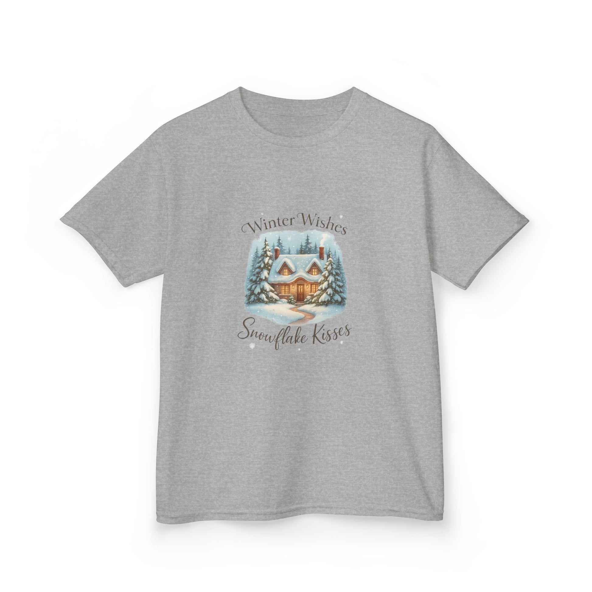 Celebrate the season with this adorable holiday tee! Featuring a charming, snow-covered cottage scene with 'Winter Wishes' and 'Snowflake Kisses', this shirt is perfect for Christmas. Crafted from soft, breathable fabric, it's ideal for kids' parties and everyday wear. The cute graphic design combines a whimsical winter scene with a hint of adventure, making it a delightful gift.